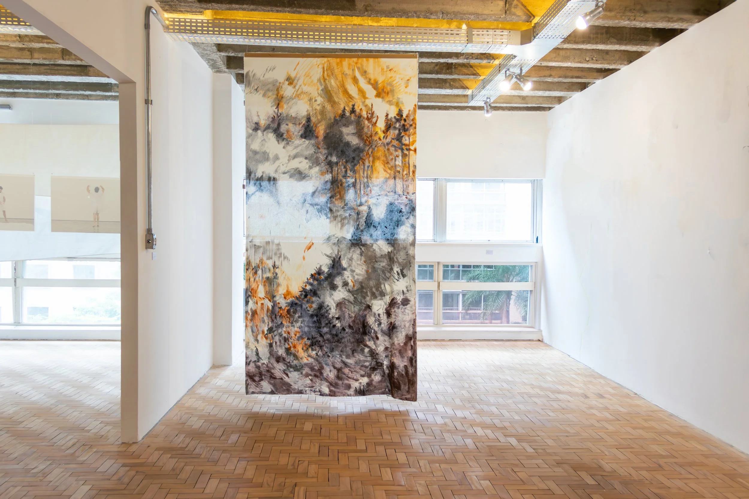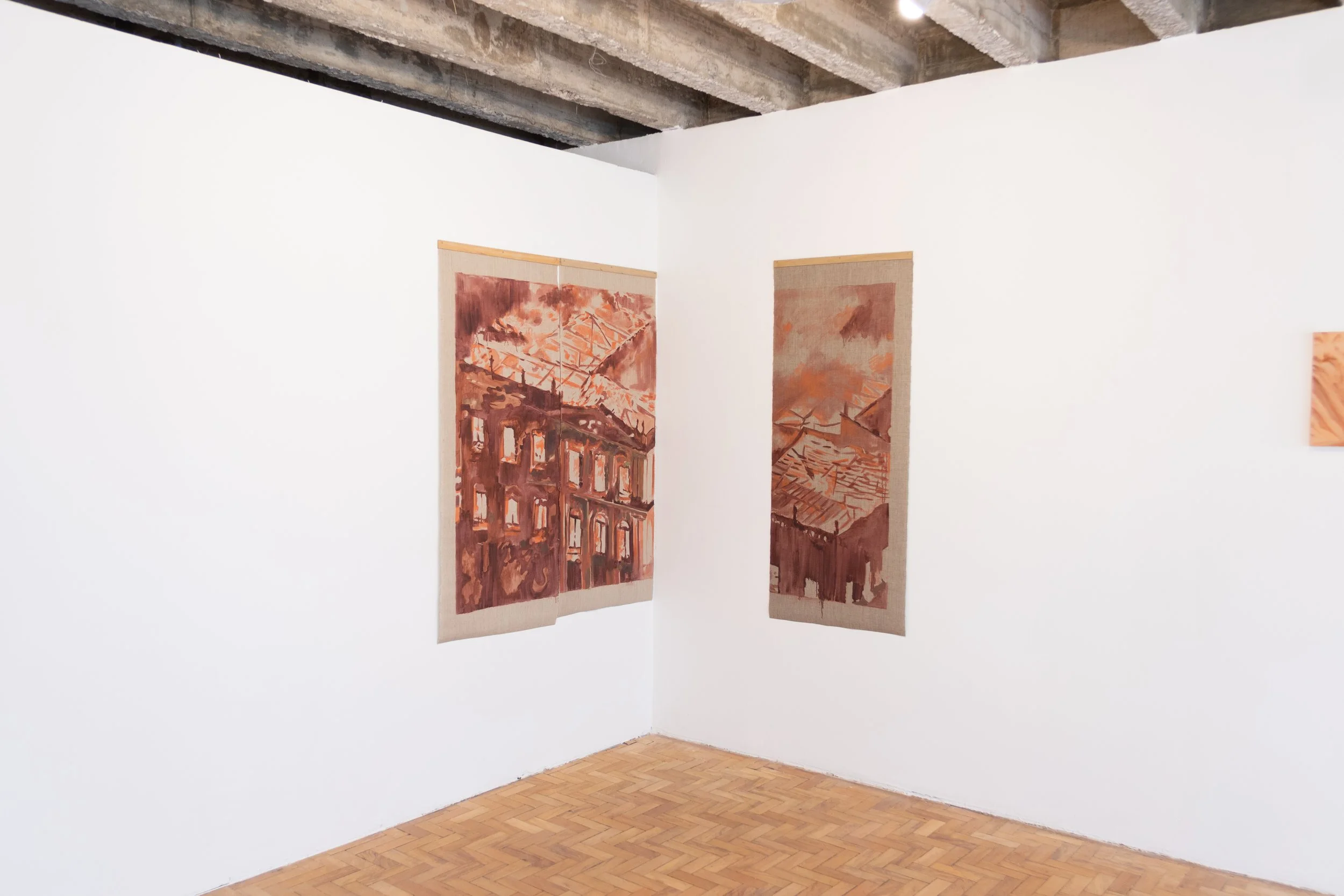 Incendio no Museu Nacional (2024) Óleo sobre l linho com primer transparente. 150 x 240 cm. Vista na exposição coletiva Vão e Vinco (2025) Curadoría de Julia Cavazzini, Espaço Republica,São Paulo, Brasil
